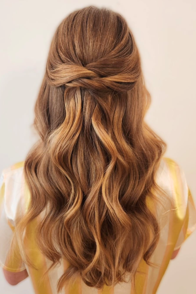 For those who want a little bit of updo without fully committing, the half-up wavy knot is ideal. This style keeps hair out of your face while letting soft waves cascade around your shoulders.