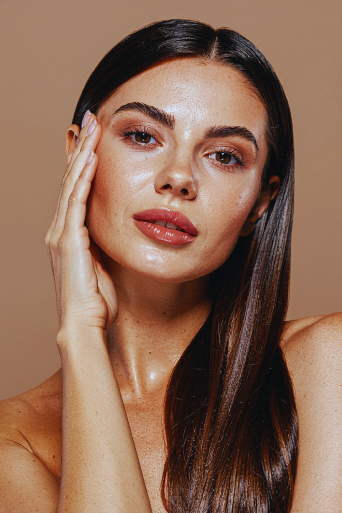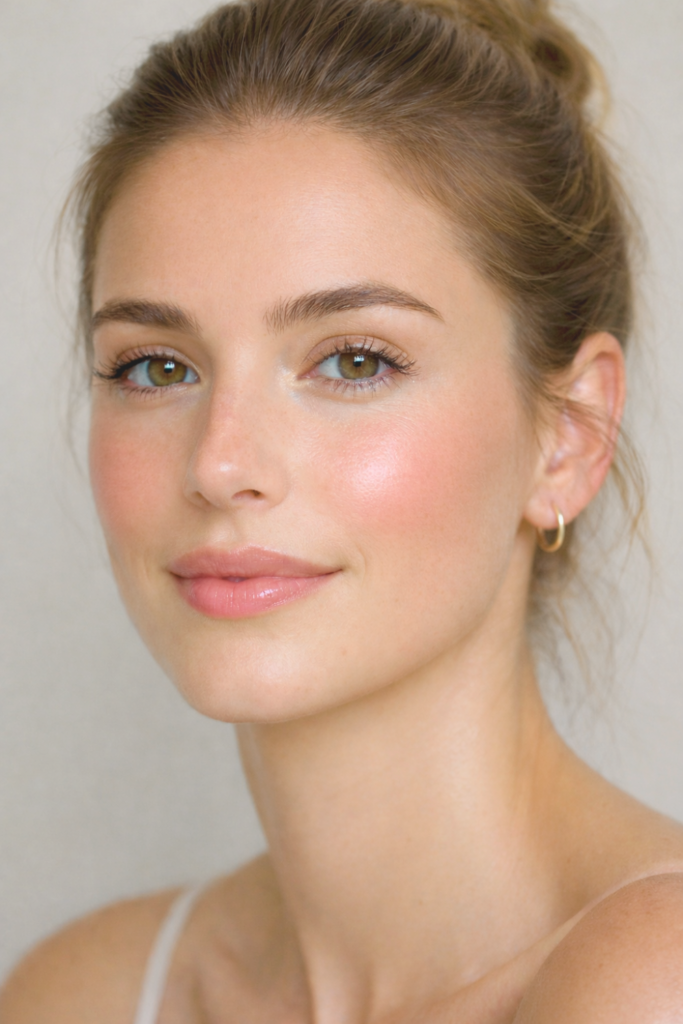 This look focuses on brushed brows, hydrated skin, subtle blush, and natural lips. Everything looks polished but minimal.
