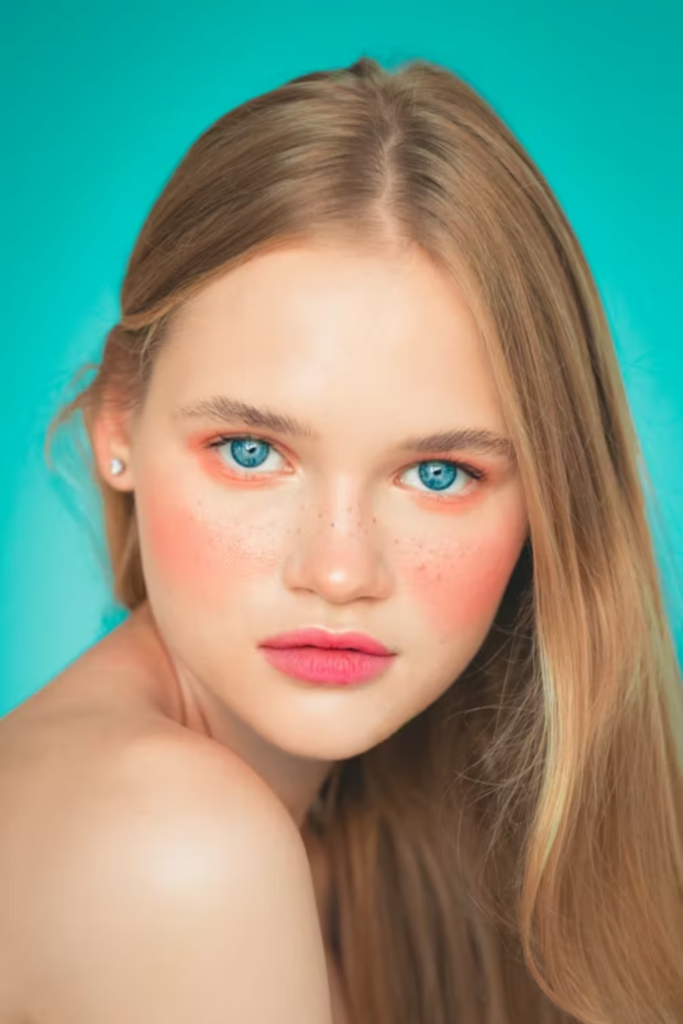 Extra blush across the cheeks and nose creates a fresh, youthful appearance. Keeping the eyes simple allows the skin to stand out.