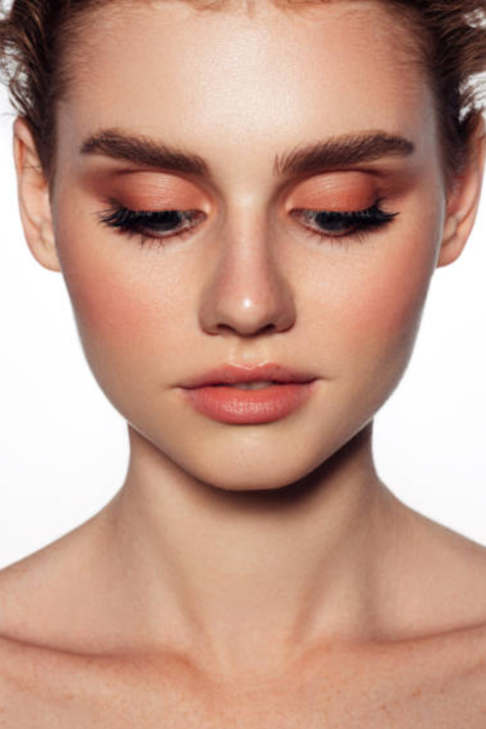 Muted peach and warm brown tones softly blended across the eyes mimic sunset colors. This look adds warmth and depth while still staying wearable and summer-appropriate.