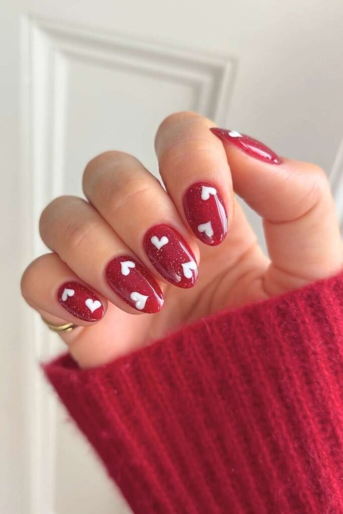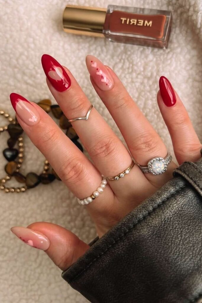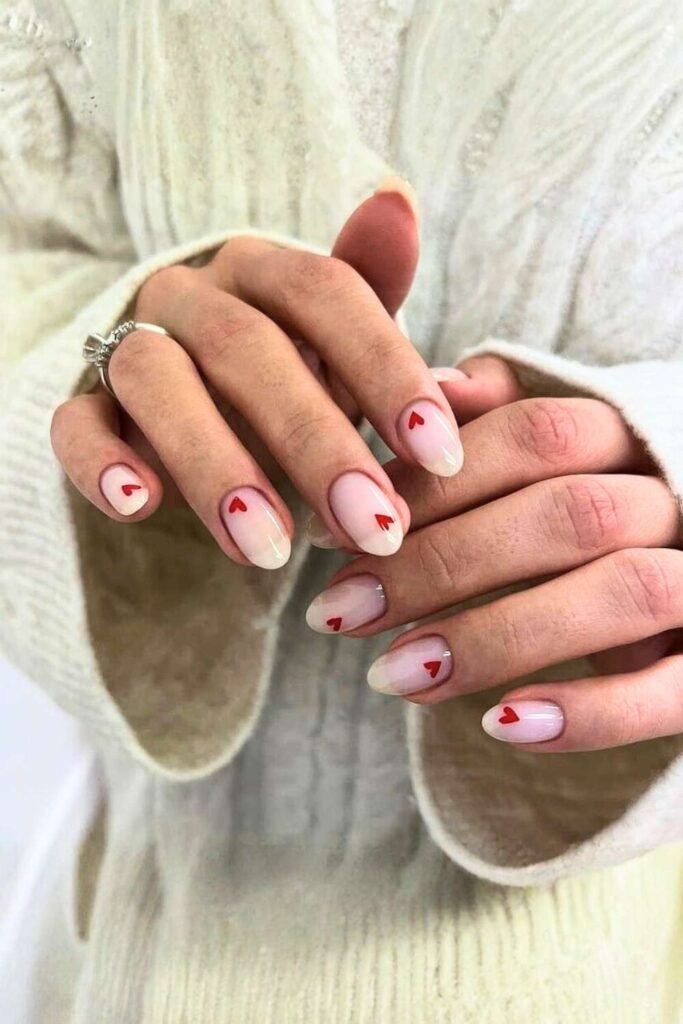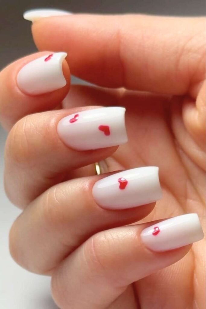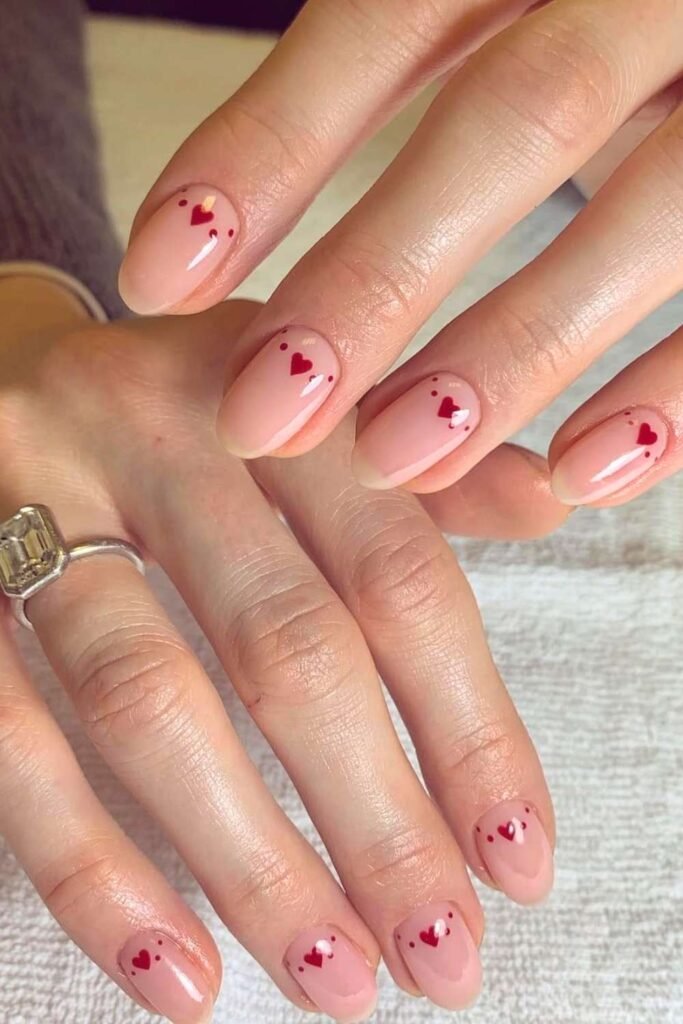 You can never go wrong with red heart nails for Valentine’s Day. A nude or soft pink base with tiny red hearts is one of the most saved styles on.