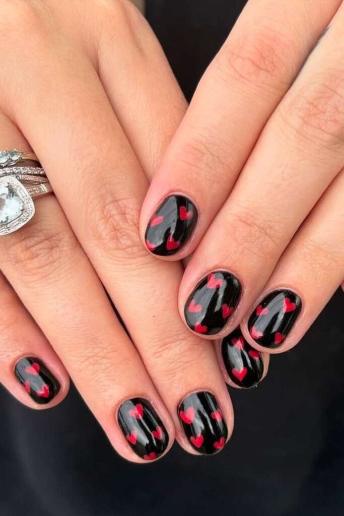 For a bold and edgy look, black and red Valentine nails are a hit. This design is perfect for those who want something dramatic and different while still staying on theme.