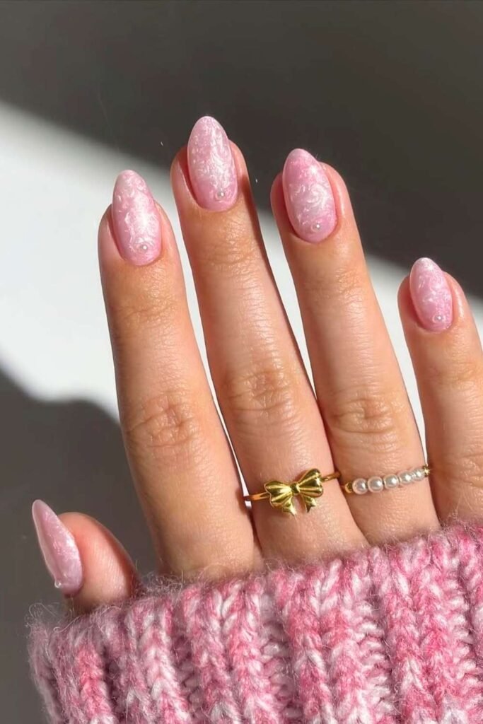 Pearls add a soft, romantic touch to Valentine nails. Blush pink nails with tiny pearl accents feel elegant and feminine, perfect for special occasions or date nights.