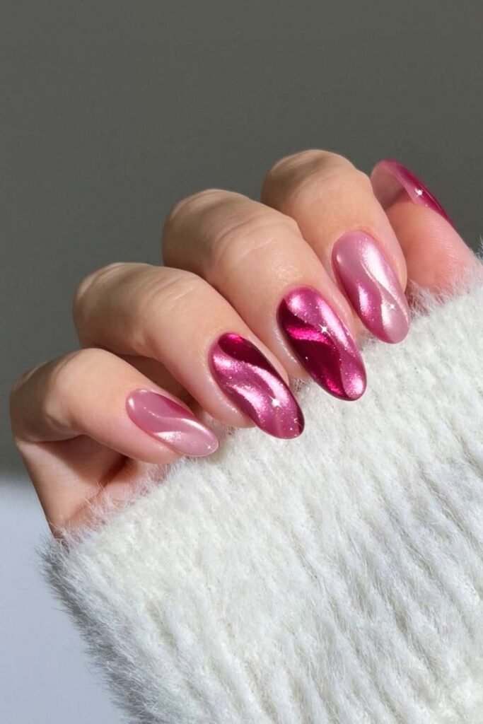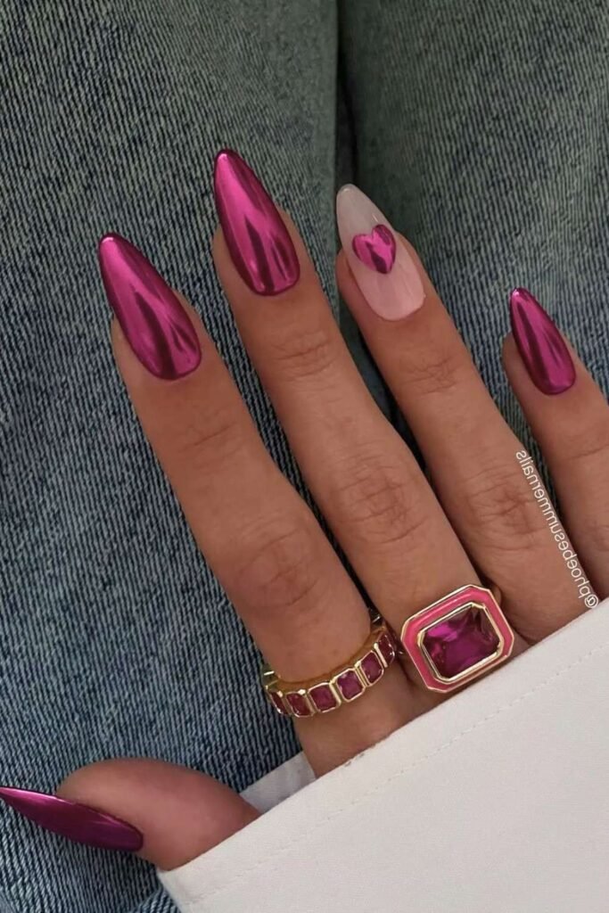 Chrome nails are huge on , and pink chrome is a Valentine favorite. The glossy, mirror-like finish catches the light and looks stunning in photos.