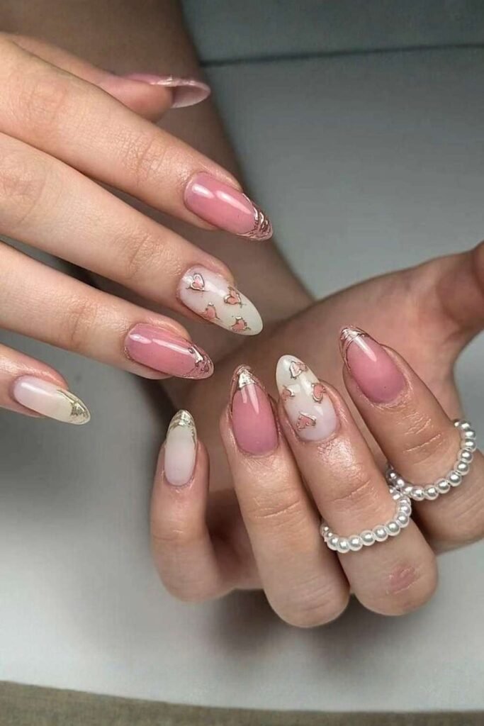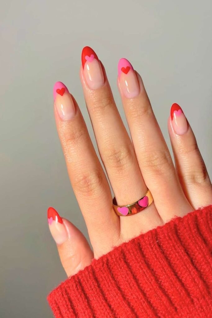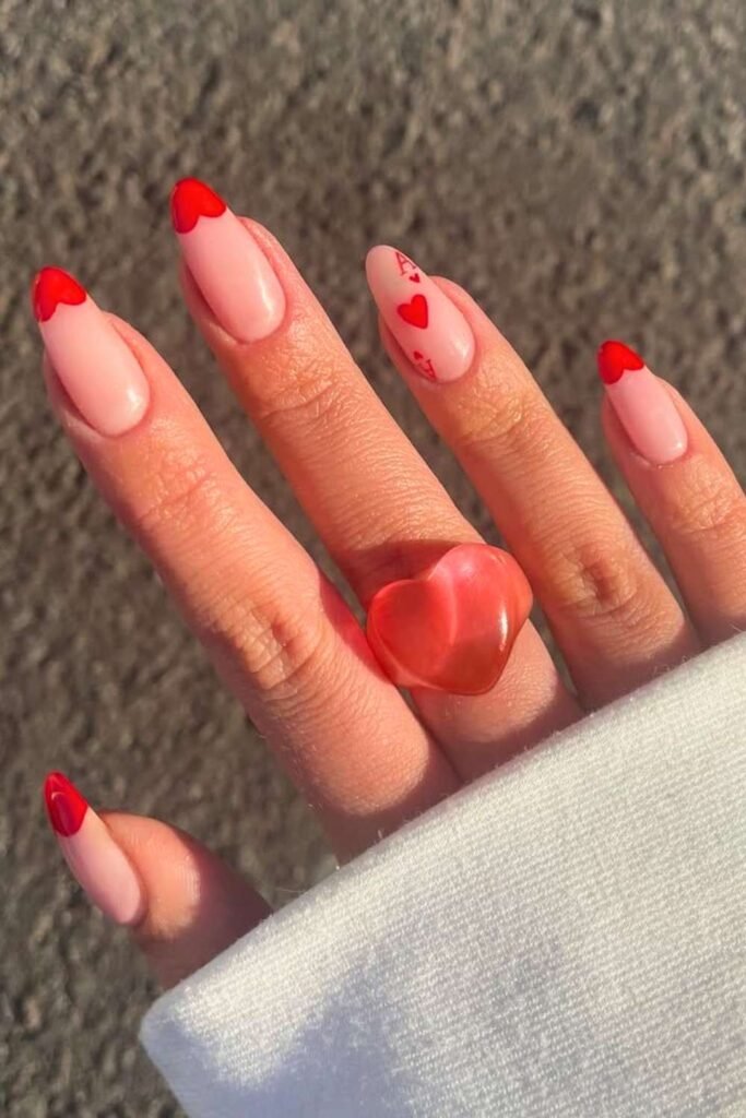 Mix-and-match Valentine nail art combines multiple designs—hearts, French tips, solid colors, and accents. This style is fun, creative, and highly savable, making it perfect for.