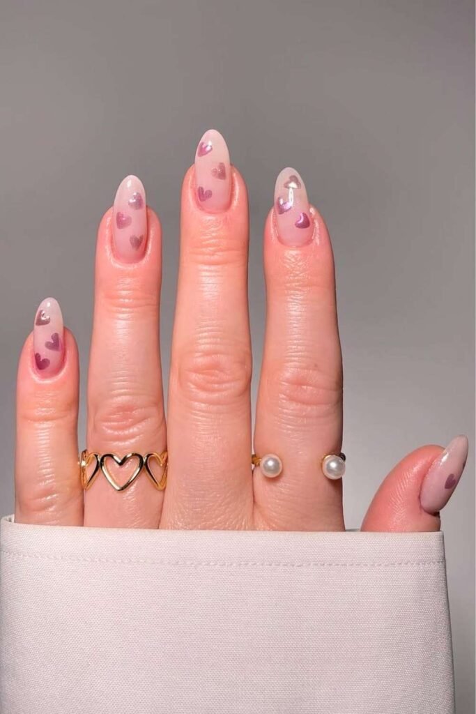 Floating heart designs on a sheer or milky base feel soft and romantic. This style looks delicate and modern, which is why it’s trending in Valentine Nail Art searches.