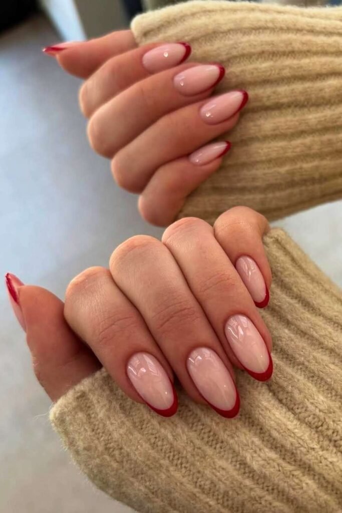 Red French tips on a nude base are one of the most pinned Valentine nail styles. They’re bold but wearable and flatter all nail lengths.