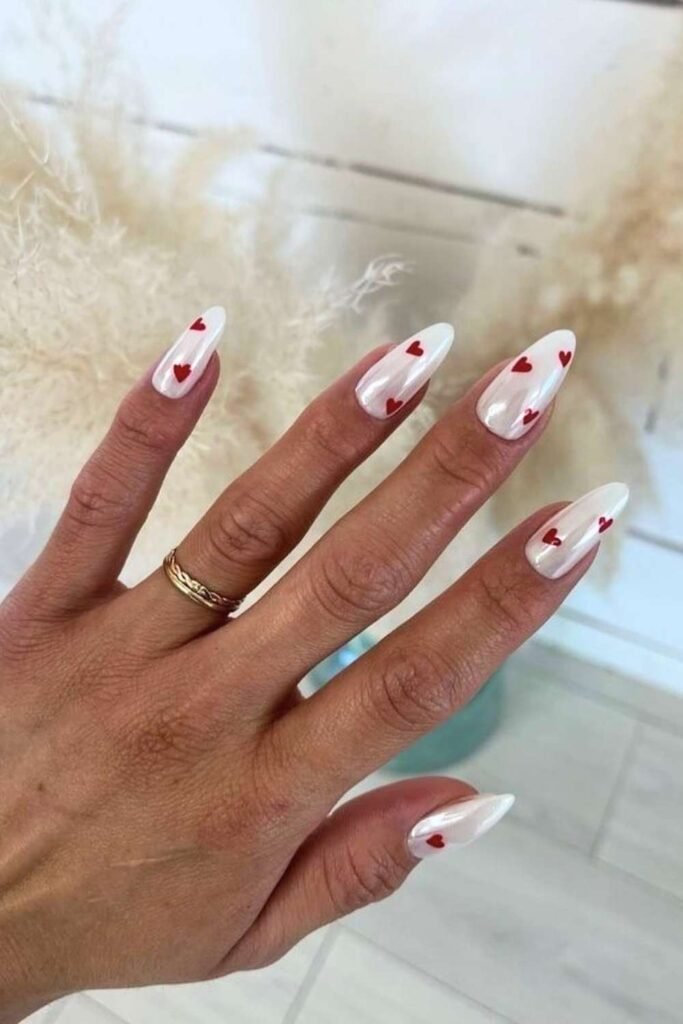 White nails make the perfect canvas for Valentine nail art. Tiny pink or red hearts on a white base look fresh and sweet.