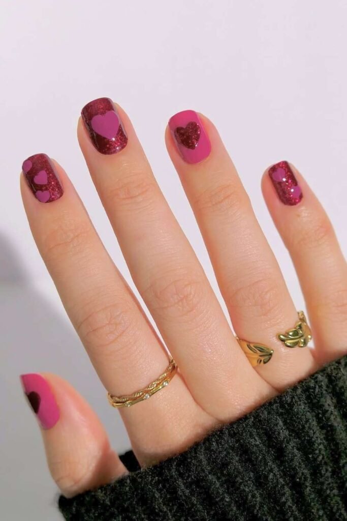 Mismatch nails are a big trend, and Valentine’s Day is the perfect excuse to try them. Mix pink, red, hearts, and simple patterns across different nails.