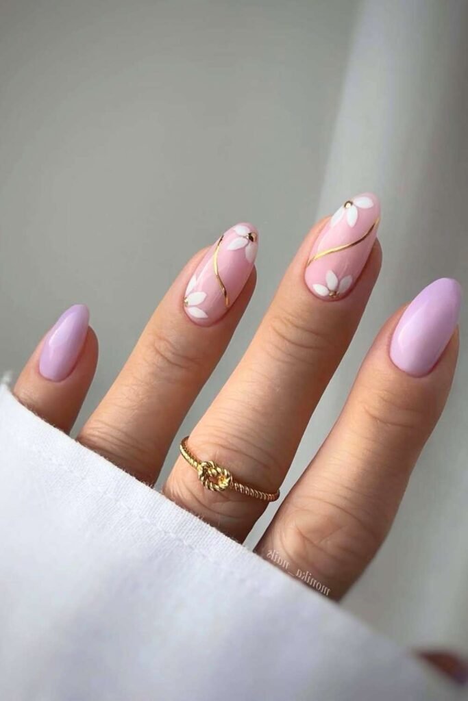 Gold accents elevate any nail design. Light pink nails with subtle gold lines or foil details feel elegant and luxurious.
